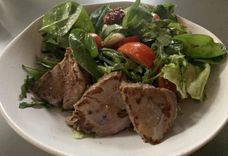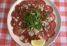 Карпаччо из говядины, крем из шампиньонов, рукола